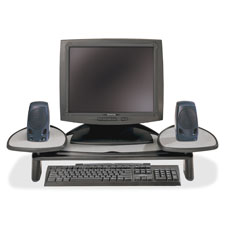 | Monitor Stand,Flat Panel,Adj,34"x14"x2-1/2-4-1/2",BK. Monitor stand features a special thin, sleek design for flat-panel monitors. As a part of the SmartFit System, the monitor stand offers a simple setup that maximizes the ergonomic benefit for improved comfort. Easily adjust in height from 2-1/2" to 4-1/2" above the desk, allowing keyboard storage. Monitor stand supports up to 35 lb. and is sized to accommodate flat panel monitors up to 21". Design includes two adjustable stands for speakers, a PDA cradle or other workstation tools. Nonslip rubber feet and top keep your items secure.